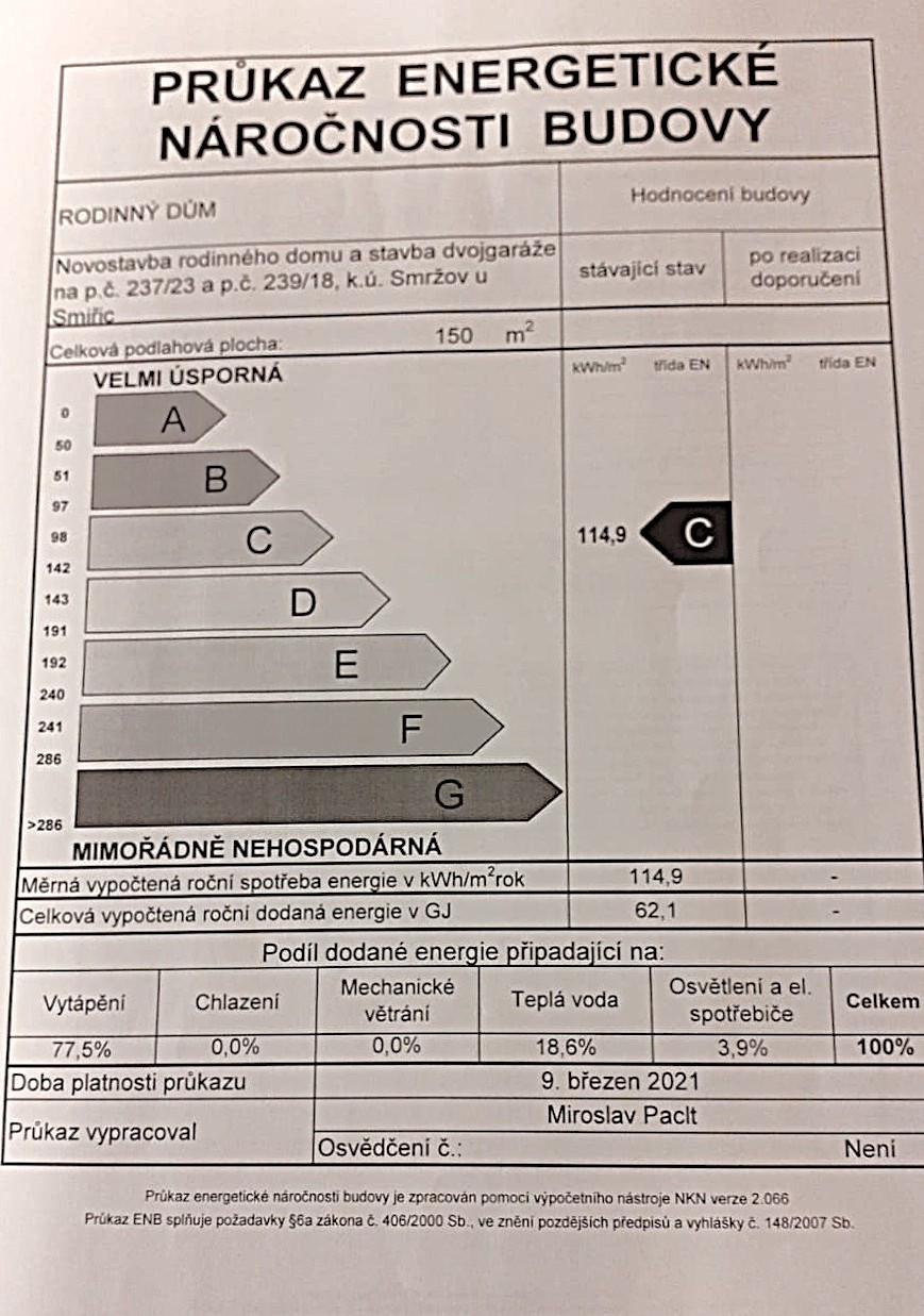 Nabízíme ke koupi poctivou stavbu z cihel značky Heluz, kde bylo při výstavbě dbáno na kvalitu bydlení a nízké provozní náklady. Bezbariérová stavba byla navržena do nejmenších detailů. Velká obytná místnost je spojená s prostornou kuchyní se spíží, jídelním a klidovým prostorem a vstupem na terasu. Čtyři samostatné místnosti umožňují dostatek soukromí každému členu rodiny. Promyšlenost dispozice potvrzují 2 toalety a technická místnosti, kde se vše schová. V případě potřeby lze dobudovat v podkroví ještě další úložné prostory. Okna směrovaná na všechny světové strany dávají dostatek světla v celém domě. Teplotní komfort zateplené budovy je zajištěn ústředním vodním topením s elektrickým kotlem, doplněným o kvalitní krbová kamna v hlavní obytné místnosti. Alternativně lze využít instalovaný kotel na dřevo s 1000 l zásobníkem teplé vody. V případě využití elektrokotle je ohřev teplé vody řešen elektrickým bojlerem. Voda je zajištěna z vlastní studny a odpady jsou svedeny do jímky, takže neplatíte vodné a stočné. Celkové měsíční provozní náklady se pohybují okolo pouhých 4.000,- Kč. To vše dává předpoklad spokojeného žití početnější rodiny.